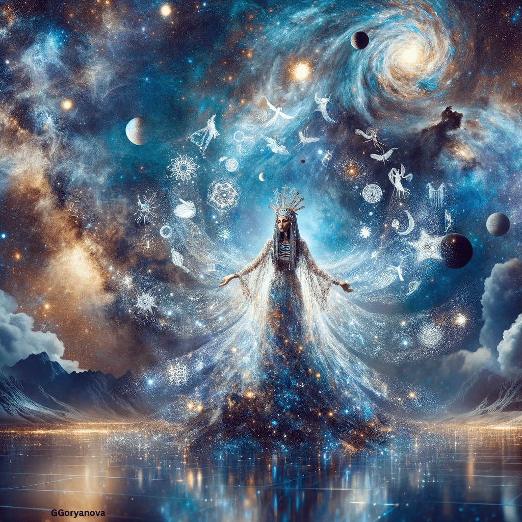 She is often depicted as a woman arched over the Earth, her body adorned with stars and the Milky Way. Her body stretches across the firmament, creating a protective veil shielding the world. She is the mother of the sun god, Ra, and the moon and stars are seen as her children, born each night and reborn each morning.